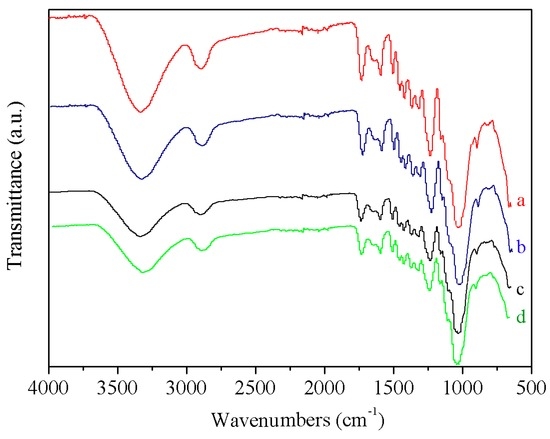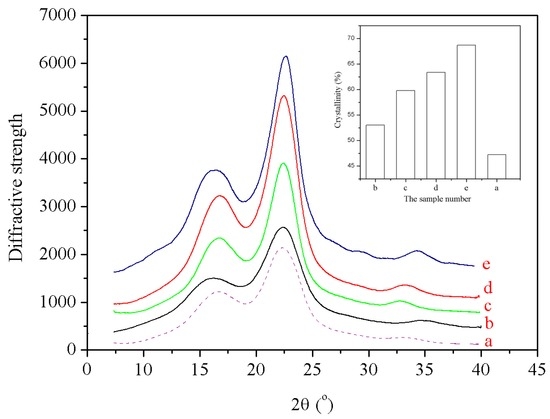 Wide-angle X-ray diffraction (WXRD) patterns of the fiber samples before and after modification were obtained using a D/MAX 2200 X-ray diffractometer (Rigaku Corporation, Sendagaya, Japan). Prior to the measurement, the sample was placed onto the supporter and compactly pressed. The WXRD data were generated by a diffractometer with CuKα radiation (λ = 1.542 Å) at 40 kV and 30 mA over the angular range 2θ = 5°–40°, and a step size of 5°·min−1. The degree of crystallinity or crystallinity index (CI, %) for each sample was evaluated by using Equation (1):