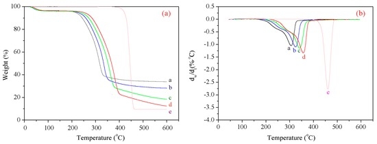 Figure 6a,b show the themogravimetric (TG) and derivative thermal gravimetric (DTG) curves for the untreated and treated wood fibers, respectively. Figure 6 and Table 9 show that when the temperature increases from room temperature to 600 °C, the pyrolysis of the wood fibers undergoes three stages, with the second stage (210–400 °C) being the main pyrolysis stage.