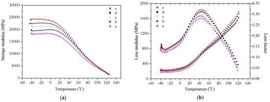 Variation of (a) the storage modulus and (b) the loss modulus and the loss factor with the steam temperature: a: untreated fibers; b: T = 120 °C, p = 0.2 MPa, t = 5 min; c: T = 160 °C, p = 0.6 MPa, t = 5 min; d: T = 160 °C, p = 0.6 MPa, t = 15 min; and e: T = 170 °C, p = 0.8 MPa, t = 5 min.