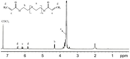 1H NMR spectrum of poly(ethylene glycol) diacrylate (PEGDA) (Mn = 6000). (δ, ppm): 3.6 (–OCH2–CH2–), 4.3 (–CH2OCO–), 5.8–6.5 (CH2=CH–).