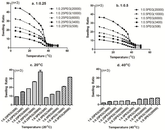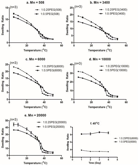 The LCST of each hydrogel was determined from the plot of the swelling ratios at different temperatures (Figure 4a,b), and the LCSTs are summarized in Table 2. With increasing weight ratios of PEGDA to NIPAm, the LCSTs of the hydrogels increased at the corresponding molecular weight of PEGDA. Except for the 1:0.25PEG(508) and 1:0.5PEG(508) hydrogels that were synthesized from liquid PEGDA (Mn = 508), the LCSTs at Mn = 3400, 6000, 10,000 and 20,000 with the same co-monomer ratio decreased with an increase in the molecular weight as a consequence of decreased number of hydrophilic oxyethylene groups [39]. Furthermore, at the same weight ratio of PEGDA, increasing the molecular weight of PEGDA decreased a molar percentage of PEGDA, and, as a result, decreased the crosslinking density of the hydrogels. Also, a decrease of the density increases spaces for a water uptake at the hydrogel. In addition, a low density of p(NIPAm-co-PEGDA) contributed to the decrease of the hydrophobic region within the gel structure and increased of the swelling capacity of the hydrogels.