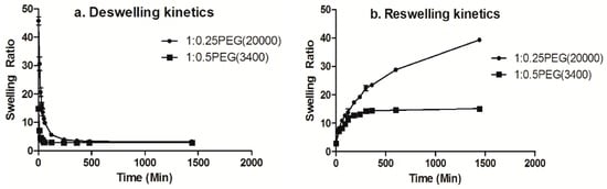 (a) Deswelling kinetics curve and (b) Reswelling kinetics curve of the 1:0.25PEG(20,000) and 1:0.5PEG(3400) hydrogels.