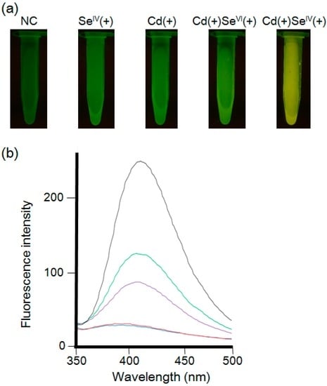 (a) F. oxysporum after the treatment of cadmium and/or selenium solution observed under the ultra violet (UV) light (wavelength: 365 nm). NC: Negative control without treatment of cadmium and selenium solution. SeIV (+): 5 mM Na2SeO3 treatment. Cd (+): 5 mM CdCl2 treatment. Cd (+) SeVI (+): 5 mM CdCl2 and 5 mM Na2SeO4 treatment. Cd (+) SeIV (+): 5 mM CdCl2 and 5 mM Na2SeO3 treatment; (b) The fluorescence spectra (excitation at 310 nm) of extracts from the mycelial cells in each condition using ultrasonication. Bold black line: 5 mM Cd (+) SeIV (+). Green line: Cd (+). Purple line: Cd (+) SeVI (+). Red line: SeIV (+). Blue line: negative control.