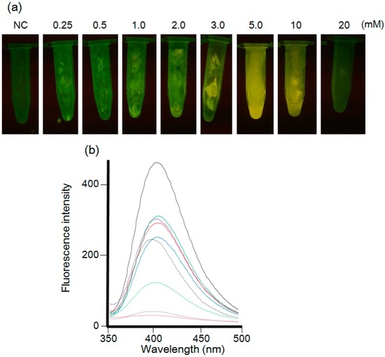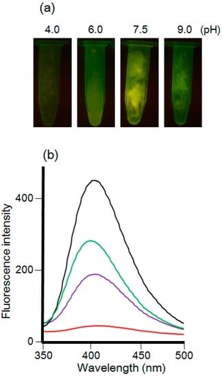 The pH of the solution was also optimized. The mycelial cells were suspended in each of the solutions of pH 4.0, 6.0, 7.5, and 9.0, which were prepared using 50 mM potassium hydrogen phthalate, 50 mM sodium phosphate, 50 mM HEPES, and 50 mM Ches, respectively (Figure 4). The transilluminator and fluorescence spectra showed that pH 7.5 resulted in the highest fluorescence intensity.