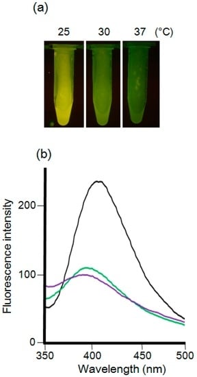 Finally, the incubation temperature was optimized. Mycelial cells suspended in a 5 mM Cd (+) SeIV (+) solution (pH 7.5) were incubated at 25, 30, or 37 °C (Figure 5). The transilluminator and fluorescence spectra showed that, when incubated at 30 and 37 °C, the fluorescence intensities of mycelial cells were much lower than when incubated at 25 °C. The incubation at 30 and 37 °C shifted the maximum fluorescence wavelength to 390 nm suggesting that smaller sized CdSe quantum dots were synthesized. The high temperature increased the speed of CdSe precipitation in the solution. The high speed of precipitation might induce the formation of smaller particles, or the different incubation temperatures may change the metabolism of F. oxysporum. Given these results, we decided to use the 5 mM Cd (+) SeIV (+) solution (pH 7.5) at 25 °C for the production of fluorescence in F. oxysporum mycelial cells.