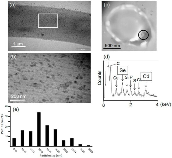 To reveal the fluorescent substances in F. oxysporum, the mycelial cells were observed by TEM (Figure 6). Dried mycelial cells incubated with a 5 mM Cd (+) SeIV (+) solution (pH 7.5) at 25 °C were applied to the TEM grid. TEM observation indicated numerous black nanoparticles (Figure 6a,b). Because it is difficult to determine the localization of black nanoparticles in mycelial cells, we prepared ultra-thin cross-sections of the fixed mycelial cells in epoxy resin with an ultra-microtome. Using these cross-sections, black nanoparticles were observed inside the mycelial cells (Figure 6c). An EDS analysis showed that the black nanoparticles were mainly composed of cadmium and selenium, indicating that they were CdSe quantum dots (Figure 6d). Other elements (C, Cu, Si, P, S and Cl) except for cadmium and selenium were detected. Since the black particles were synthesized in the cytoplasm of the cell, C, P, S and Cl, derived from the organic components in the cell, were detected. On the other hand, Cu and Si were contaminants from the grid or resin. These results suggested that CdSe quantum dots were synthesized in the cytoplasm after the uptake of cadmium and selenium ions into the cell. The distribution of particle size in the TEM image was analyzed using ImageJ (Figure 6e). The smallest particle size was about 8 nm. The 14–16 nm particle size was a major distribution. Since some particles aggregated each other, such particles were excluded for the counts.