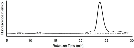 To purify the CdSe quantum dots, the extracts of the mycelial cells, following ultrasonication, were subjected to gel-filtration column chromatography (Figure 7). The fluorescence intensity was monitored at 410 nm with an excitation wavelength of 310 nm. There were no peaks from mycelial cell extracts treated with the HEPES buffer (pH 7.5) without cadmium and selenium ions at 25 °C. A sharp peak with a retention time of 24 min was detected from extracts of the cells treated with a 5 mM Cd (+) SeIV (+) solution (pH 7.5) at 25 °C. These results suggest that the size and shape of the CdSe quantum dots are uniform when synthesized by F. oxysporum.