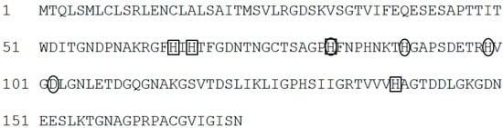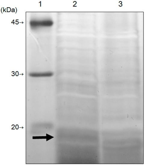 The protein band on SDS-PAGE described above was excised from the gel, destained according to the protocol by the SilverQuest Silver Staining Kit (Invitrogen, Carlsbad, CA, USA), dehydrated with acetonitrile, and dried. The residue was treated with 50 µL of a reducing solution (10 mM dithiothreitol (DTT) and 100 mM NH4HCO3) for 1 h at 56 °C and 50 µL of an alkylating solution (55 mM iodoacetamide and 100 mM NH4HCO3) for 45 min at room temperature in the dark. The residue was further treated successively with 100 mM NH4HCO3 (100 µL) for 10 min, acetonitrile (100 µL) for 15 min, 100 mM NH4HCO3 (100 µL) for 10 min, and acetonitrile (100 µL) for 15 min and dried. Proteins in the gel were digested overnight at 37 °C with 10 µL of 10 µg/mL Trypsin Gold (Promega, Madison, WI, USA) in 50 mM NH4HCO3. The liquid portion of the reaction mixture was transferred to a new tube. The remaining gel residue was extracted three times with 20 µL of a water solution containing 50% acetonitrile and 0.05% trifluoroacetic acid (TFA). The latter extracted solution was pooled with the former liquid portion and dried. Residual pellet was dissolved in 20 µL of a water solution containing 2% acetonitrile and 0.05% TFA, and was vortexed for 5 min. After centrifugation, the supernatant was transferred into an analytical vial, and a liquid chromatography/mass/mass LC/MS/MS analysis was performed in an Orbitrap VEROS ETD system (Thermo Fisher Scientific, Carlsbad, CA, USA).