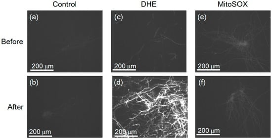 The washed mycelial cells of F. oxysporum before and after treatment with the Cd (+) SeIV (+) solution were mixed with mitoSOX and dihydroethidium (DHE) to detect cellular superoxide (Figure 10). The mitoSOX identified superoxide in the mitochondria, whereas DHE identified superoxide in the cytoplasm [,]. We set the same exposure time for the pictures to compare the intensity of fluorescence. Washed mycelial cells of F. oxysporum before and after treatment with the Cd (+) SeIV (+) solution without mitoSOX and DHE showed no fluorescence (Figure 10a,b), suggesting that the mycelial cells do not contain appreciable amounts of endogenous fluorescent substances. The washed mycelial cells of F. oxysporum following treatment with the Cd (+) SeIV (+) solution exhibited the strongest fluorescence with a DHE reagent (Figure 10d). On the other hand, weak fluorescence was detected before the treatment (Figure 10c). In the mitoSOX experiment (Figure 10e,f), the weak fluorescence was also detected suggesting that superoxide did not occur in the mitochondria. These results suggest that, following treatment with the Cd (+) SeIV (+) solution, F. oxysporum accumulated superoxide in the cytoplasm. This result is consistent with the decrease in cytoplasmic FoSOD of F. oxysporum after treatment with the Cd (+) SeIV (+) solution. Recently, some previous reports suggested that superoxide is related to a reduction of metal ions. Rose et al. (2005) showed that superoxide is used for the reduction of Fe(III) in Lyngbya majuscule to absorb the Fe(II) using a Fe(II) transporter []. Hansel et al. (2012) reported that Stilbella aciculosa oxidizes Mn(II) to Mn oxides by producing extracellular superoxide during cell differentiation []. Yin et al. (2016) revealed that superoxide reduced Ag+ ion to make the silver nanoparticles in F. oxysporum []. Superoxide might be related to the reduction of Se(IV). Increased cytoplasmic superoxide may induce the expression of various reductases and secondary metabolites, which may play a role in the synthesis of CdSe quantum dots in F. oxysporum. To reveal the detailed molecular mechanism, however, further analyses will be needed.