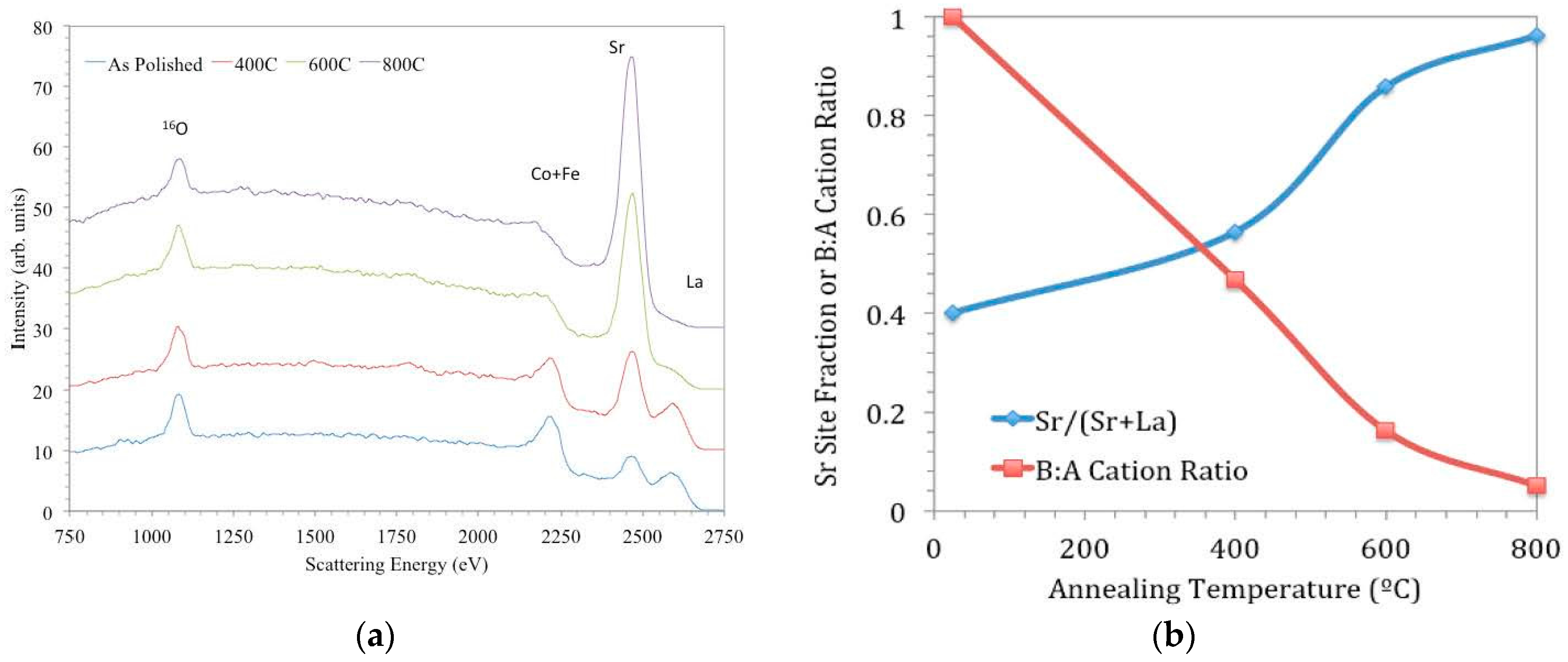 Figure 10a, the peaks in the spectrum for the as-polished sample correspond to all the elements present in the bulk composition—O (1181 eV), Fe (2311 eV) and Co (2342 eV; these cannot be resolved with the He beam due to similar masses), Sr (2541 eV), and La (2701 eV). (Peak energies quoted correspond to the high energy onset of the peaks, and the peak apexes appear at slightly lower energies due to inelastic scattering processes.) Peak intensities for surface elements are proportional to their coverage (by a sensitivity factor dependent on the element’s mass), and so changes in their intensities are indicative of changes in outermost surface coverage. From the other spectra in