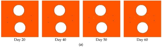 Although the damage zone area that developed each day shows good agreement with the AE events, as shown in Figure 13, especially during days 1–20 and 40–60, the simulation result during days 21–39 is relatively different from the monitoring. After the temperature increasing stage from day 1 to 19, the temperature around the deposit holes reaches about 22 °C and basically remains stable during days 21–39. A relatively small number of AE events are recorded during this time. However, in our simulation no damage occurs at the same time. It is likely that the actual damage process of rock, especially of jointed and heterogeneous rock masses, takes a relatively long time to complete, including damage in local mesoscopic minerals, stress redistribution, permeability variation, water pressure, and rock temperature variation. This time-dependent effect of the rock mass, however, is not considered in our simulations.