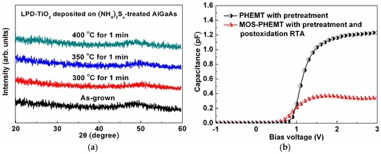 (a) XRD spectra of LPD-TiO2 deposited on sulfide-pretreated AlGaAs with and without postoxidation RTA; (b) C-V comparison for sulfide-pretreated PHEMT and MOS-PHEMT with postoxidation RTA.