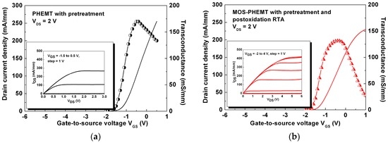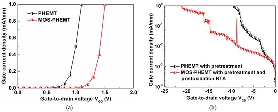 The LPD-TiO2 caused an improvement in the breakdown voltage associated with the gate leakage current of the typical gate-to-drain diode characteristics, as shown in Figure 5. Figure 5a shows that the turn-on voltage (Von) of the MOS-PHEMT, 1.5 V, was obviously higher than that of the referenced PHEMT, 1.1 V. For the MOS-PHEMT, the gate leakage current density was suppressed by approximately two orders of magnitude, and the corresponding reverse gate-to-drain breakdown voltage (BVGD) was more than −21.2 V, as shown in Figure 5b. The Von and the BVGD were defined as the voltage at which the gate current reaches 1 mA/mm. Generally, an increased Von accompanies an improved gate voltage swing. The gate leakage current density of the MOS-PHEMT was lower because of the MOS structure and the elimination of the sidewall leakage path passivated by the LPD-TiO2.