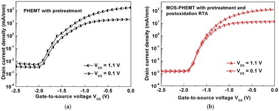 Subthreshold characteristics of: (a) referenced PHEMT; and (b) MOS-PHEMT with VDS = 0.1 V and 1.1 V.
