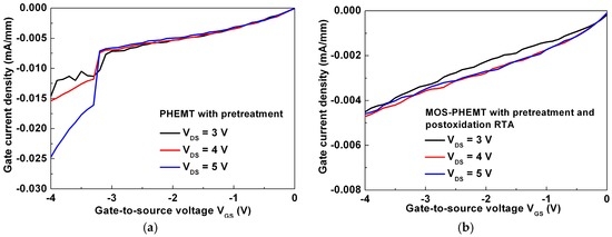 Gate current density versus VGS with different VDS for: (a) referenced PHEMT; and (b) MOS-PHEMT.