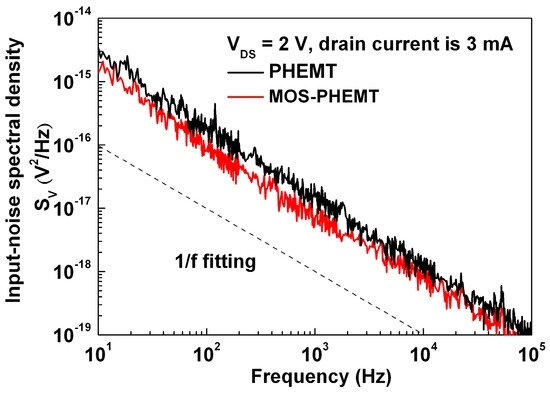 Figure 8 shows the low-frequency flicker noise spectral density (SV) characteristics, which were measured using a BTA 9812B noise analyzer and an Agilent 35670A dynamic signal analyzer. On-wafer flicker noise measurements of the referenced AlGaAs/InGaAs PHEMT and AlGaAs/InGaAs MOS-PHEMT were conducted under VDS of 2 V and drain current of 3 mA for frequencies between 10 Hz and 100 kHz. SV can be expressed as follows [27]: