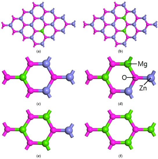The relaxed structure of MgxZn1−xO monolayer (a) x = 0.0625; (b) x = 0.125; (c) x = 0.25; (d) x = 0.5; (e) x = 0.75; (f) x = 1.