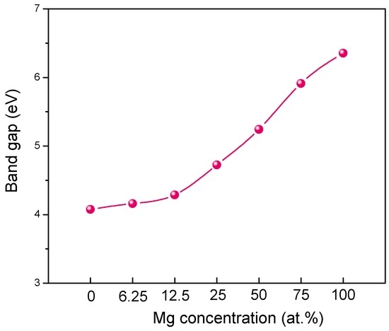 - Choopun, S.; Vispute, R.D.; Yang, W.; Sharma, W.R.P.; Venkatesan, T.; Shen, H. Realization of band gap above 5.0 eV in metastable cubic-phase MgxZn1−xO alloy films. Appl. Phys. Lett. 2002, 80, 1529–1532. [Google Scholar] [CrossRef]