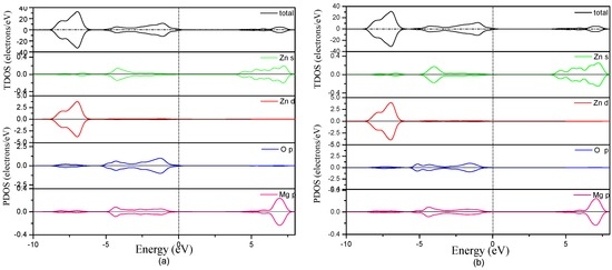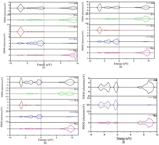 The total and partial DOS of MgxZn1−xO monolayer (a) x = 0.0625; (b) x = 0.125; (c) x = 0.25; (d) x = 0.5; (e) x = 0.75; (f) x = 1.