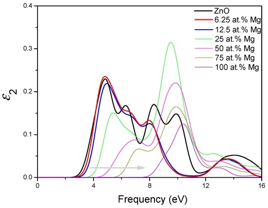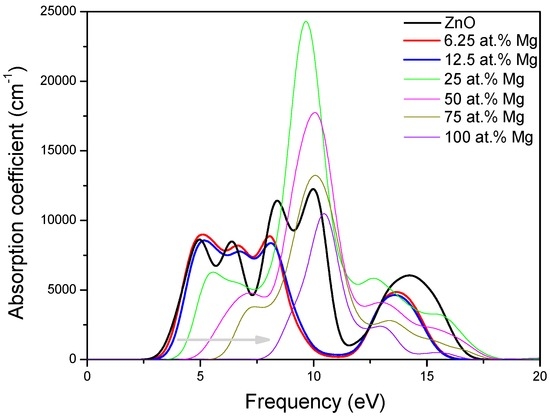In general, the optical properties of semiconductor are closely related to their electronic structures and are of great importance to its application. Thus, we investigate the optical properties of MgZnO monolayer. The imaginary part of the dielectric function can be calculated from the momentum matrix elements between the occupied and unoccupied wave functions and the real part of the dielectric function can be evaluated from the imaginary part by the Kramer-Kronig relationship [48]. The absorption coefficient can then be obtained from and . It is known that the imaginary part of the dielectric function is very important for any materials, thus for MgZnO monolayer are presented in Figure 6. It can be seen that there are three main peaks in for MgZnO monolayer with different Mg concentrations. In the case of pristine ZnO monolayer, the first peak at 4 eV should mainly be caused by the transition between O 2p states in the highest valence band and Zn 4s states in the lowest conduction band, which is related to the direct band gap. The second peak at 8 eV can be due to the transition between the Zn 3d and O 2p states. The weak peak at 14 eV is mainly derived from the transition between the Zn 3d and O 2s states. The main effect of Mg doping lies in that the first peak due to the optical transition between the Zn 4s and O 2p states obviously shifts toward the high energy side with increasing Mg concentration, indicating that the band gap is increasing. Moreover, the strength of the first peak obviously decreases with the increase of Mg concentration. This is due to that the increase of Mg concentration corresponds to decrease of Zn 4s states, resulting in the decrease of transition between the VBM and CBM. Furthermore, we have calculated the absorption coefficient of pristine ZnO monolayer and MgZnO monolayer, as shown in Figure 7. The changes of line shapes, energy positions, and strengths of the peaks of absorption spectrums with the increasing Mg concentration are similar to those of the imaginary part of the dielectric function. Particularly, it is worth noting that compared to pristine ZnO monolayer, the optical absorption edge of MgZnO monolayer has a clear blue-shift to a shorter wavelength region with increasing Mg concentration, which may have potential application for designing ultraviolet optoelectronic devices. The blue-shift of the absorption edge could be ascribed to the increase of band gap induced by Mg incorporation.
