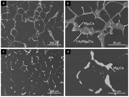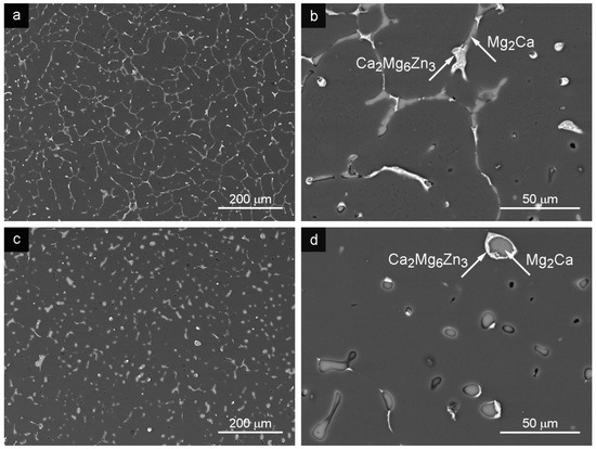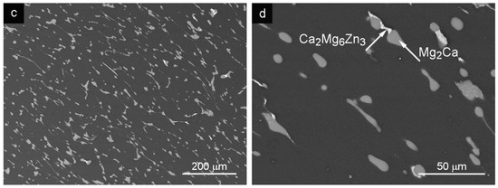 HT of the alloy in SCS state resulted in the dissolution of the present intermetallic phases (Figure 3c,d). In the microstructure of SCS alloy after the HT, no Ca2Mg6Zn3 phase particles were observed. The Ca2Mg6Zn3 phase was completely dissolved during the HT and absorbed by other structural components. Only rounded Mg2Ca particles, situated in the grain boundaries, were observed in the microstructure (Figure 3d). The remaining Mg2Ca phase particles became larger compared with the particles estimated after the heat-treated GC and SCL states as is demonstrated in Figure 1c,d and Figure 4c,d. Also in the case of the SCS alloy after HT, the chemical composition, shown in Table 2, indicates the absorption of Zn and Ca atoms from the dissolved Ca2Mg6Zn3 phase into the matrix and the Mg2Ca phase respectively.