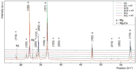 Chemical composition of the observed intermetallic phases in the alloy processed by different technologies was modified due to the heat treatment in all the cases (Table 2). The X-ray pattern of Mg-3Zn-2Ca alloy processed by different methods is shown in Figure 5. The phase composition of the matrix (α grains) and the present intermetallic phases was similar for all the alloy states after applied HT. Only in the case of the SCS + HT alloy state was the Ca2Mg6Zn3 phase completely dissolved and absorbed by other structural components during the heat treatment (matrix and the Mg2Ca phase) (Table 2, Figure 3c,d). The phase composition of the alloy was not changed by ECAP treatment compared to the GC state.