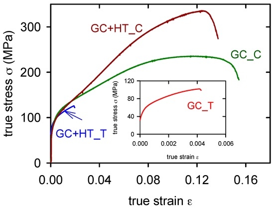True stress–strain curves obtained at room temperature in tension and compression for the GC alloy are introduced in Figure 6. Characteristic values—the yield stress, σ02, the ultimate tensile/compression strength σUTS/σUCS, strain to fracture, ε, were evaluated and are presented in Table 3 and Table 4. All mechanical characteristics were estimated with the standard deviation of ±5%.
