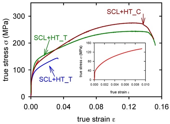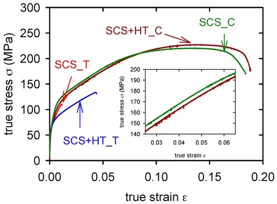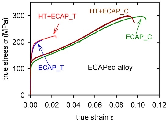 True stress–true strain curves obtained for ECAPed alloy and HT + ECAPed alloy in tension (T) and compression (C).