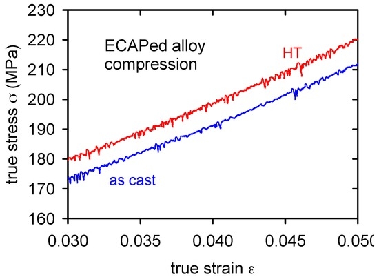 The stress–strain curves of ECAPed alloy and HT + ECAPed alloy are introduced in Figure 9. Significant difference was found between the yield stresses in tension and compression (see Table 3 and Table 4). Serrated flow was found in both compressive curves ECAP and HT + ECAP as is demonstrated in Figure 10.