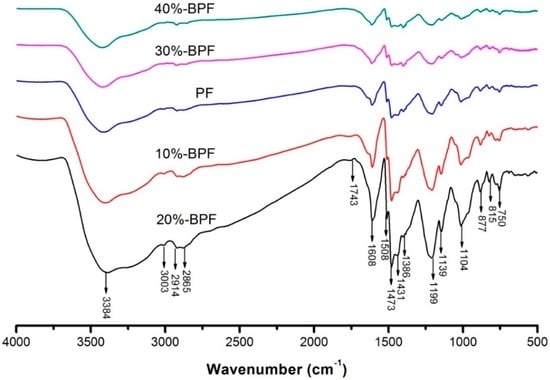 To investigate the chemical structure of BPF resin synthesized with various amounts of bio-oil addition, the 4000–400 cm−1 infrared spectral region was shown in Figure 1. The PF resin was also analyzed as a comparison. Following recognized peak identifications of the infrared spectra of organic compounds, functional groups corresponding to the major peaks in the spectra were identified and listed in Table 2. The BPF resins had FTIR spectra similar to that of PF resin, suggesting that the BPF resins exhibited similar molecular structure as compared to the PF resin.