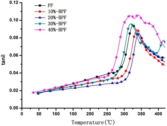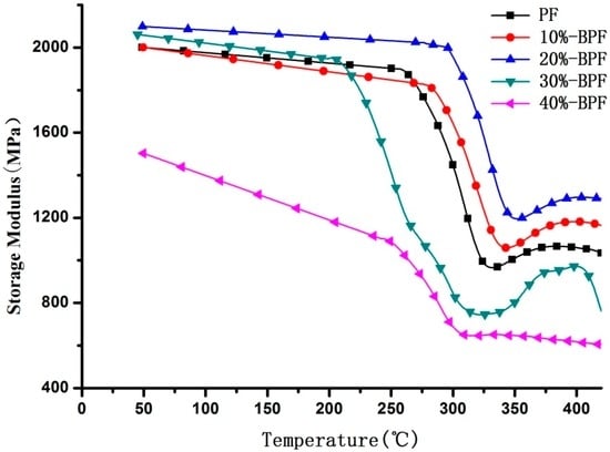 In Figure 2 and Figure 3, which showed the differential and storage modulus curves of BPF resins, 20%-BPF resin has a minimum peak value in and maximum value in storage modulus while the glass transition is occurring. It was concluded that suitable proportion of bio-oil added to PF resin would be conducive to form a three-dimensional structure in cross-linking reaction, which could improve the heat resistance of resin. However, the curve of 40%-BPF showed the maximum peak value in and minimum value in storage modulus, compared with other types of BPF resins. It was probably that excess bio-oil could not take part in the synthesis process of resin due to insufficient formaldehyde, as mentioned in the previous discussion. This moiety of bio-oil would affect the completeness of crosslinking in the resin, which led to being easily degraded and gasified as heated. Moreover, the curve of 40%-BPF resin had two obvious peaks, revealed that the molecular weight distribution was rather complicated due to excessive bio-oil existing.