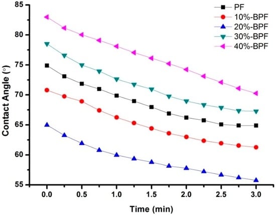 The bonding results determined the final performances of GF/BPF composites; therefore it was important to investigate the interface characteristics of BPF resins and GF. As shown in Figure 4, the dynamic contact angle between various BPF resins and GF was measured. This indicated that the contact angle diminished gradually and kept steady in the end when contact time was prolonged. The contact angles were relatively low at the bio-oil addition of 20%, possibly due to including more functional groups in the 20%-BPF resin, but when the bio-oil addition was kept increasing (over 20%), bonding properties became weakened as the contact angle increased. The result of the test was consistent with the performances of GF/BPF composites listed in Table 1, implying that adding the right amount of bio-oil could improve the interface characteristics of GF/BPF composites.