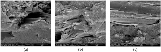 The SEM images of the cryogenically fractured surface of GF/BPF composites with bio-oil addition of 0%, 20%, and 40% respectively, were shown in Figure 5a–c. In Figure 5a, the fracture surfaces of GF/PF composites appeared to be smooth and flat, indicating cured PF resin with greater brittleness, and some separations and holes can be observed because of the weak adhesion between resin and fiber. When bio-oil addition reached to 20%, the fracture surface of the samples (Figure 5b) became rough and gradually transformed to be a hummocky fracture, which suggested that GF embedded in 20%-BPF resin hindered the flat extension of the fracture surface. However, when the amount of bio-oil increased to 40% (Figure 5c), the phenomenon related to the fiber pulling was evident, demonstrating that little bonding strength existed at the interface of GF and 40%-BPF resin. The above results suggested that GF could be well wetted and embedded in 20%-BPF resin, which coincided with the DW analysis.