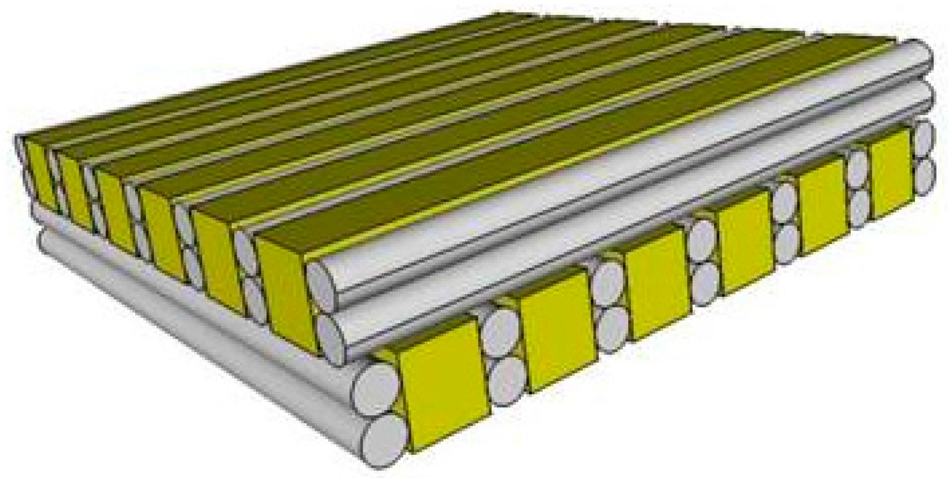 For scaffold fabrication a bioplotting system (type Bioscaffolder 2.1, GeSiM mbH, Großerkmannsdorf, Germany) was used. The scaffold design was generated with the “ScaffoldGenerator software” (GeSiM mbH). The scaffold geometry was set to 10 mm × 10 mm × 4.5 mm. Scaffolds were built of 18 double layers, means each layer consists of two struts plotted in reverse directions (as schematically shown in Figure 1). Subsequent layers were positioned in a 90° pattern with either 10 or 14 parallel lines with equal interspace. A conic aluminium nozzle (Vieweg GmbH, Kranzberg, Germany) with a diameter of 250 µm was used. The plotting speed was set to 4 mm/s and pressure to 410 kPa for all PCL or PCL-PEG compositions. The processing temperature was set at 120 °C for PCL, 110 °C to 100 °C for PCL-PEG 80-20 and 90 °C to 80 °C for PCL-PEG 70-30. Further increase of PEG content resulted in scaffolds of inferior quality.