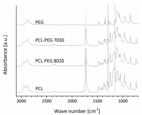 It is shown that typical PCL absorption bands attributed to the C-O and C-C stretching in the crystalline phase (at ~1295 cm−1) [28], the C=O carbonyl stretching (at ~1730 cm−1) [28,29] are visible for pure PCL and the PCL-PEG blends, but not for pure PEG. The peak at around 1287 cm−1 is sharper for pure PEG and PCL-PEG blends [30]. The peak at around 1158 cm−1 attributed to ether groups [31] is sharp for the pure PEG and it is also present in the spectra of PCL-PEG blends. For pure PCL, there is a slightly shifted peak at 1171 cm−1, which could be ascribed to the C-O and C-C stretching in the amorphous phase [28]. Peaks of both pure materials were found in the blend compositions, but there are no shifts or new peaks visible indicating possible intermolecular interactions [29,32].