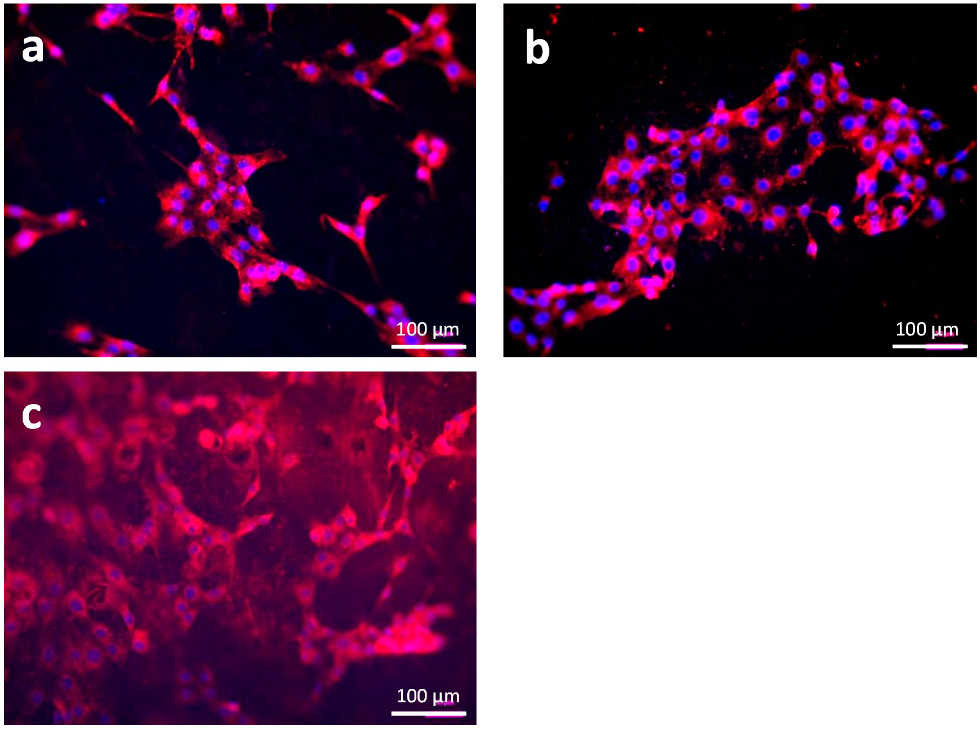 Fluorescence microscope image of PCL and PCL-PEG plates seeded with ST2 cells showing cytoplasm (red) and cell nuclei (blue) after two days of incubation: (a) PCL; (b) PCL-PEG 8020; and (c) PCL-PEG 7030.