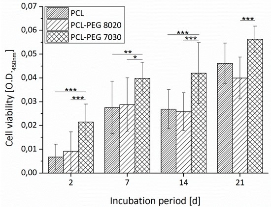 Cell viability of PCL and PCL-PEG plates seeded with ST2 cells over an incubation period of 21 days. Asterisks denote significant difference of pairwise comparison * p < 0.05; ** p < 0.01; *** p < 0.001.