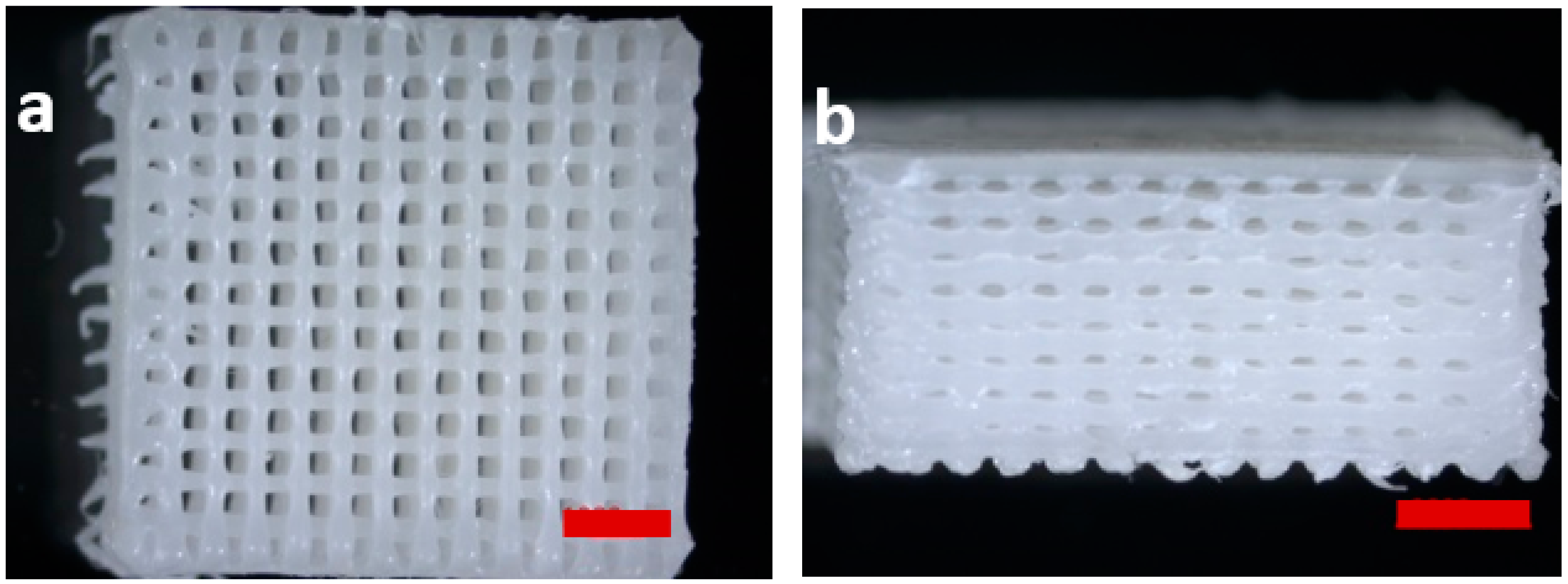Stereomicroscope images of a plotted PCL-PEG (7030) scaffold as fabricated: topview (a); and side view (b) (scale bar = 2 mm).