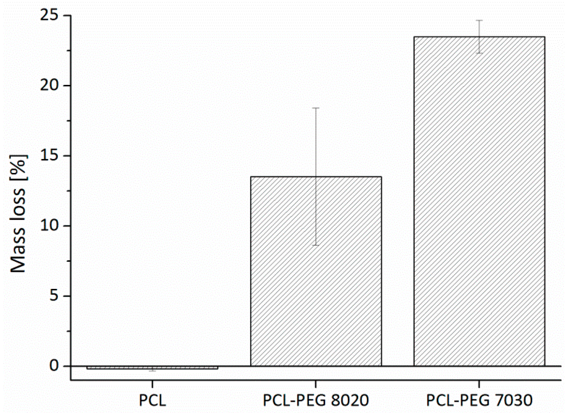 The pure PCL, as expected, showed no mass loss during three days of incubation as PCL is known to have a total degradation time up to two years depending on its initial molecular weight [34]. The PCL-PEG blends showed a fast degradation and a mass loss tending to be almost equal with the corresponding content of PEG being ~14% for the PCL-PEG 8020 and ~23% for the PCL-PEG 7030 compositions.