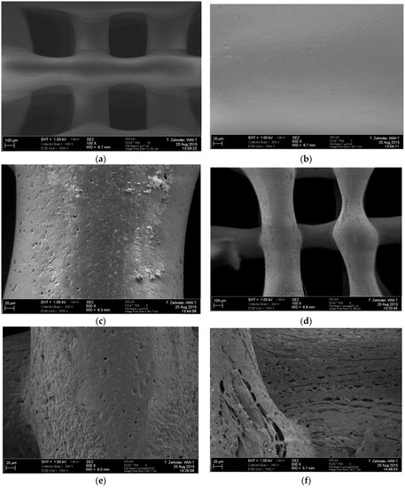 Electron microscopy images of the surfaces of PCL scaffolds as fabricated (a,b), and after three days of incubation in HBSS (c); and PCL-PEG 7030 scaffolds as fabricated (d,e), and after three days of incubation in HBSS (f) at 37 °C.