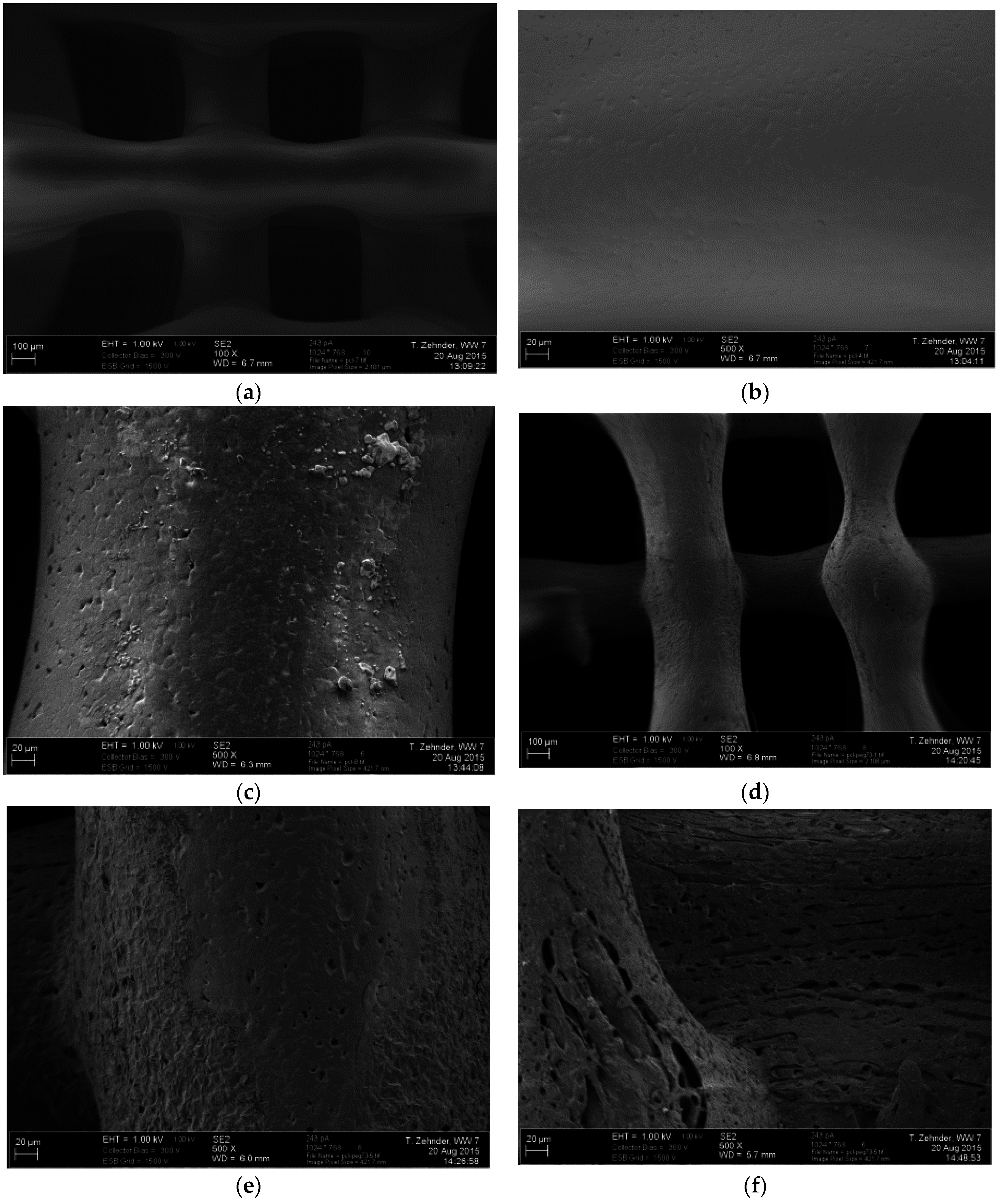 For illustrating the influence of the rapid mass loss on the external and internal morphology of the scaffold struts, SEM images are presented in Figure 8 and Figure 9. In Figure 8a,d overview images of the scaffold structures and, in Figure 8b,e detailed spot images of PCL pure and PCL-PEG 7030 scaffolds after fabrication are shown. The surface of PCL appeared smooth, whereas the blend showed a rougher surface. The images in Figure 8c,f indicate the differences after the three days incubation period at 37 °C. The pure PCL surface is still smooth, but the blend surface shows pores and an even rougher structure. This enhances the results of the mass loss study and the fast release of the PEG content. The increased surface roughness could possibly influence the increase in the cell viability shown in Figure 5. The development of an interconnected pore structure after the PEG release from PCL-PEG blends is also reported by Cheng et al. [33]. The morphology of the pore structure in this study was dependent on the PEG content, causing discrete pores with lower PEG content and an interconnected pore structure with an increased PEG content of up to 10%–30%. Further images showing cross-sections of the struts are presented in Figure 9. The cross-sections of PCL and PCL-PEG 7030 scaffolds are shown after fabrication and after three days incubation in HBSS at 37 °C. There is no apparent difference in the internal structure of the PCL scaffolds before (Figure 8b) and after (Figure 8c) the incubation. The cross-section shows a homogeneous and dense morphology. However, the cross-section of the blend appears inhomogeneous, showing two phases before the incubation (Figure 8e). The morphology shows distributed round drops, possibly PEG, surrounded by a main phase, which is the PCL matrix. After the incubation, which goes along with the mass loss, the round drops are almost not visible and a porous internal structure remains (Figure 8f).