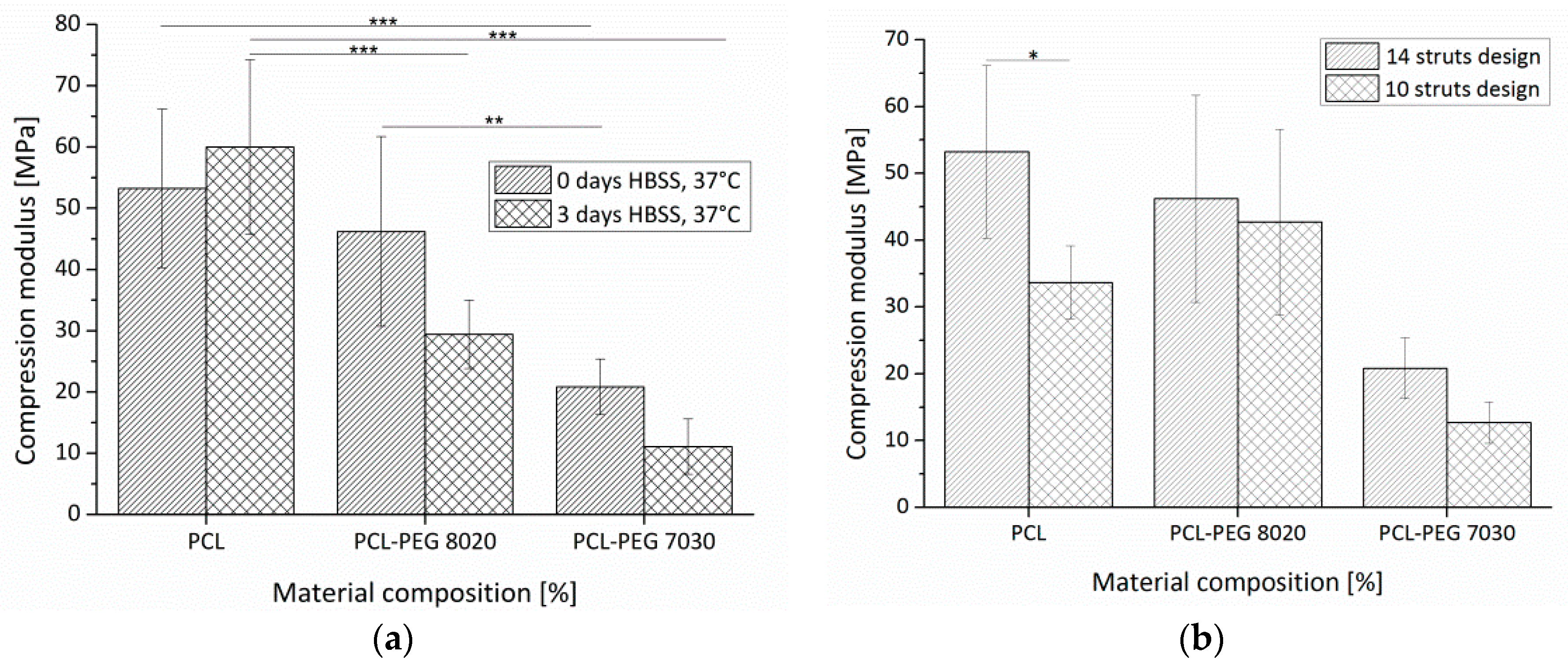 Compressive stiffness of PCL and PCL-PEG blend scaffolds with different compositions in dependence of: (a) storage time in HBSS at 37 °C; and (b) different scaffolds design. Asterisks denote significant difference of pairwise comparison. * p < 0.05; ** p < 0.01; *** p < 0.001.