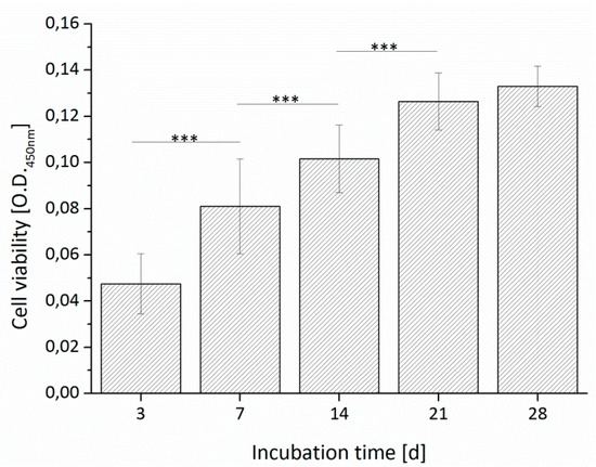 Cell viability of a PCL-PEG 7030 ADA-GEL construct with ST2 cells up to 28 days of incubation. Asterisks denote significant difference of pairwise comparison. *** p < 0.001.