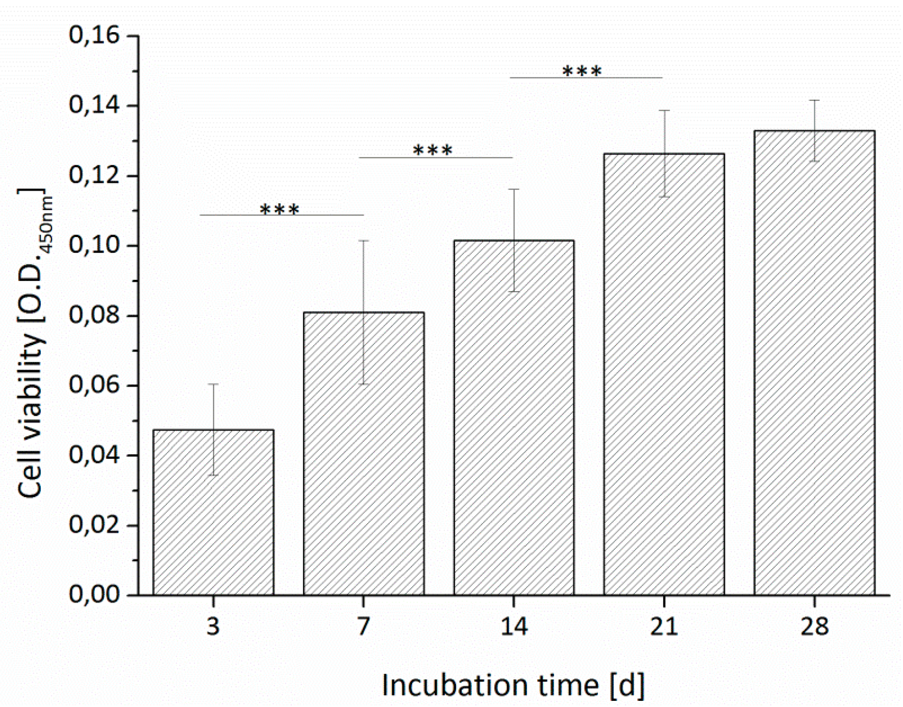 Cell viability was determined using WST-8 assay kit (Sigma-Aldrich). WST-8 assay solution and cell culture medium were mixed in a ratio of 1:100 and 1 mL was added to each sample. After 2 h of incubation at 37 °C, the absorbance at 450 nm was analysed using spectrophotometer (PHOmo, Anthos Mikrosysteme GmbH, Krefeld, Germany). The measurements were repeated after 2 days, 7 days, 14 days and 21 days of incubation.