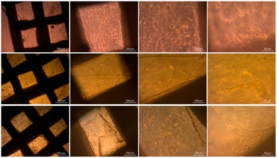 Optical microscope images of PCL-PEG ADA-GEL constructs with ST2 cells: after fabrication (upper row); after 14 days of incubation (middle row); and after 28 days of incubation (bottom row).