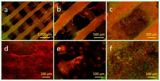 For imaging the cell adhesion and cell distribution after 28 days of incubation staining of the actin cytoskeleton (red) and the cell nuclei was performed as shown in Figure 13. In agreement with the results of optical microscopy, the fluorescence microscope images confirm that the cells migrated and proliferated on and along the PCL-PEG support structure and completely covered it, as shown in the overview images in Figure 13a,b. The detailed spot image in Figure 13d shows that the cells have a spreading morphology on the hard phase. Furthermore, the images emphasise that the cells proliferated and that also in the hydrogel phase area very large cell agglomerates could be seen in Figure 13a,c the whole area in between the hard phase is densely populated with cells. Figure 13e shows a cell agglomerate and also single spread cells in the hydrogel phase. These results indicate that a combination of PCL-PEG 7030 blend and ADA-GEL hydrogel enables movement of the cells from the hydrogel phase to the support structure. Thus, the hard phase is not only essential for the mechanical support, but also for the cellular response. This result is in contradiction to studies using PCL and cell-loaded pure alginate as in this case no influence or interaction of the immobilised cells with the PCL structure was reported [36]. The results could be explained by favourable properties of the ADA-GEL in comparison to pure alginate considering a faster degradation, influencing cell mobility, and cell-material interaction [23,41].