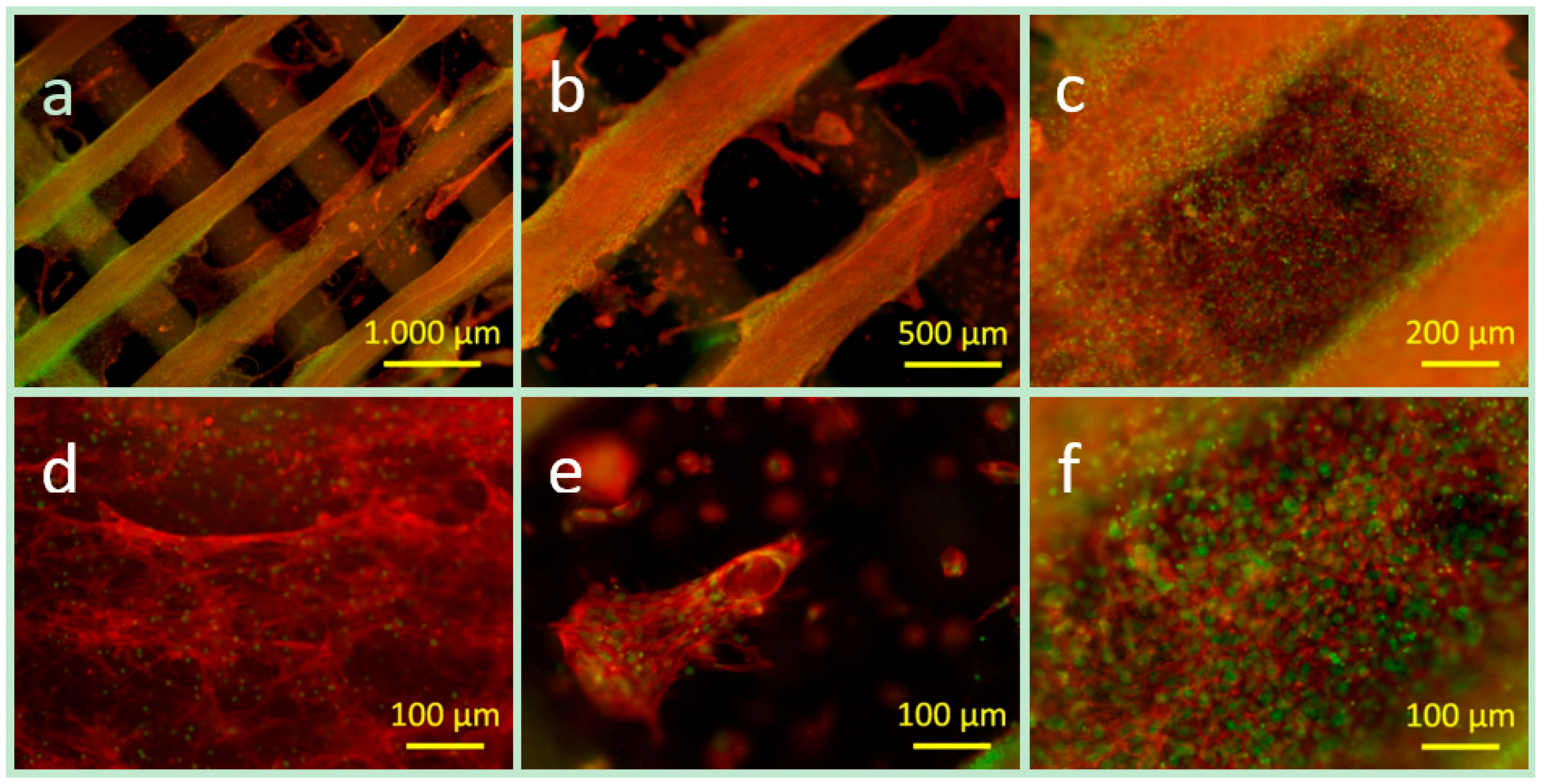 Fluorescence microscope images (a–f) of the actin cytoskeleton (red) and the cell nuclei (green) of ST2 cells in a PCL-PEG ADA-GEL construct after 28 days of incubation of different magnification: (a,b) overview images; (c) densely packed area of the cells covering both materials; (d) cell morphology on the hard phase; (e) cell agglomerate and spread single cells in hydrogel; and (f) densely packed area of cells (hydrogel phase).