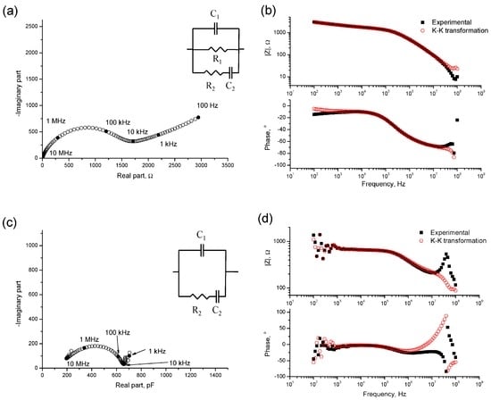 The measurements were validated using the Kramers–Kronig (K–K) [] (see Figure 1) and the differential impedance analysis was applied to them, in order to check the validity of equivalent circuit used [,,]. The impedance spectra were fitted to the equivalent circuits proposed by Cabeza et al. [] (see Figure 1), which included two time constants and have been used for different types of materials [,,]. The fitting of the measured data to the equivalent circuits has been made using a Simplex optimization method []. The impedance parameters R2, C1 and C2 are present in both contacting and non-contacting methods. Here, only the values of these parameters obtained with non-contacting method have been studied, due to its higher accuracy.