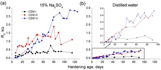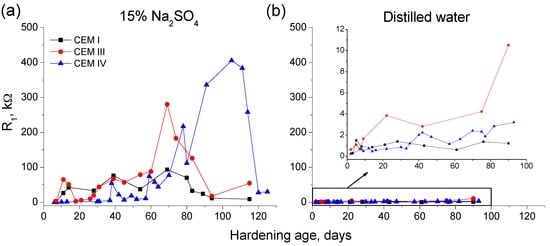 Results of resistance R2 for CEM I, III and IV grouts submerged in: 15% Na2SO4 solution (a); and distilled water (b).