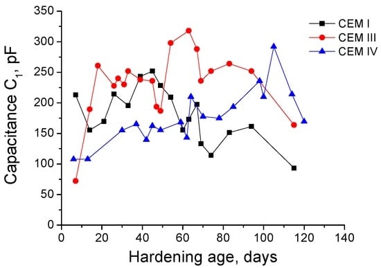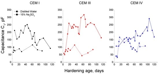 The next impedance spectroscopy results to discuss are those obtained for capacitance C1. This parameter is related to the solid fraction in the samples [], so it is expected that this parameter increases as solid formation is produced due to the development of slag and clinker hydration and fly ash pozzolanic reactions. Besides, it could be also supposed that the capacitance C1 decreases when there is a loss of solid fraction of the samples caused by the destruction of their microstructure due to the sulphate attack.